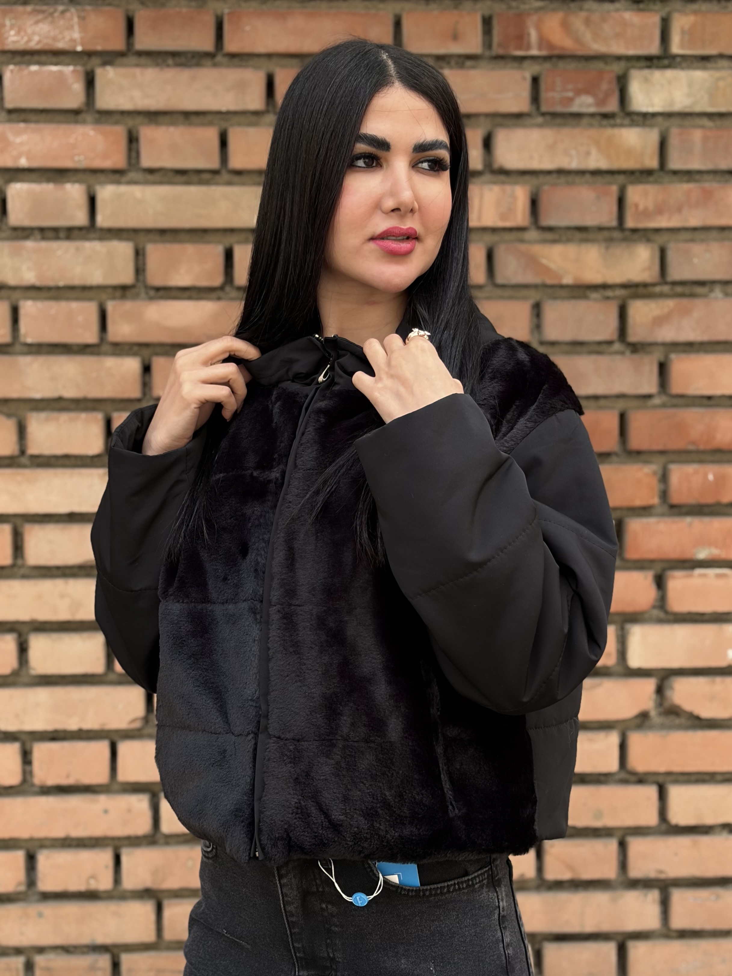 کاپشن کوتاه جلو خزدار رنگ عسلی و مشکی